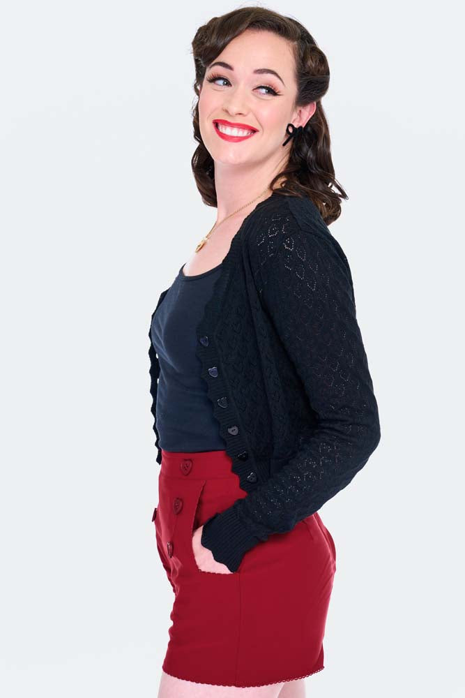 Retro red high waisted shorts in 50s style with side pockets & heart button detail. Made in a stretchy fabric with a loose fit from Voodoo Vixen .
