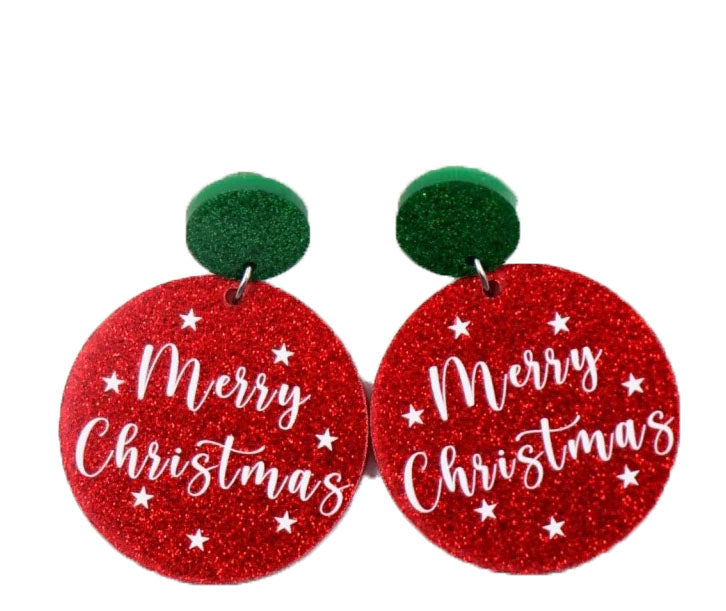 Söta örhängen tillverkade i akryl med röda hängande julgranskulor & med texten Merry Christmas