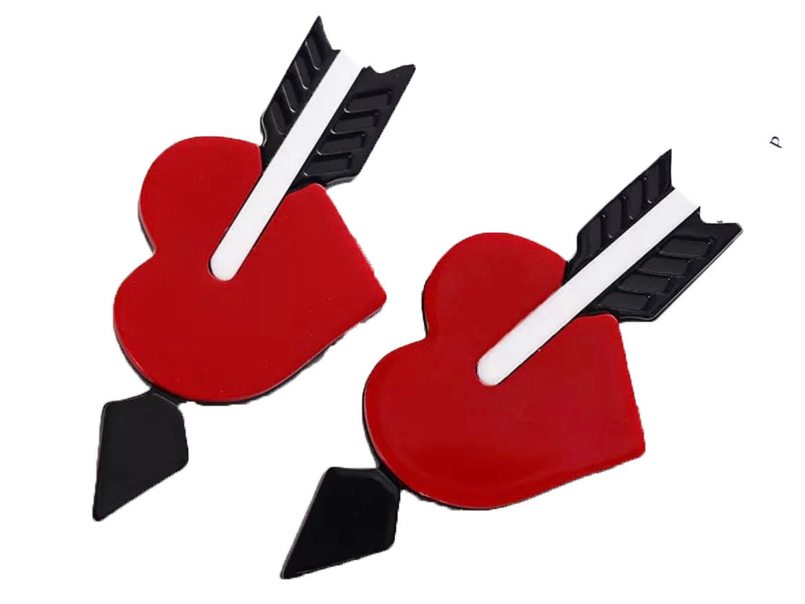 Coola örhängen med röda hjärtan med svarta pilar genom tillverkade i akryl.