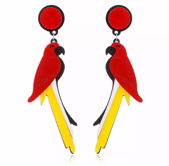 Coola färgstarka örhängen med hängande papegojor tillverkade i akryl.
