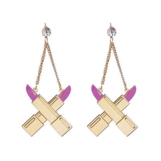 Balla örhängen med hängande läppstift tillverkade i akryl.