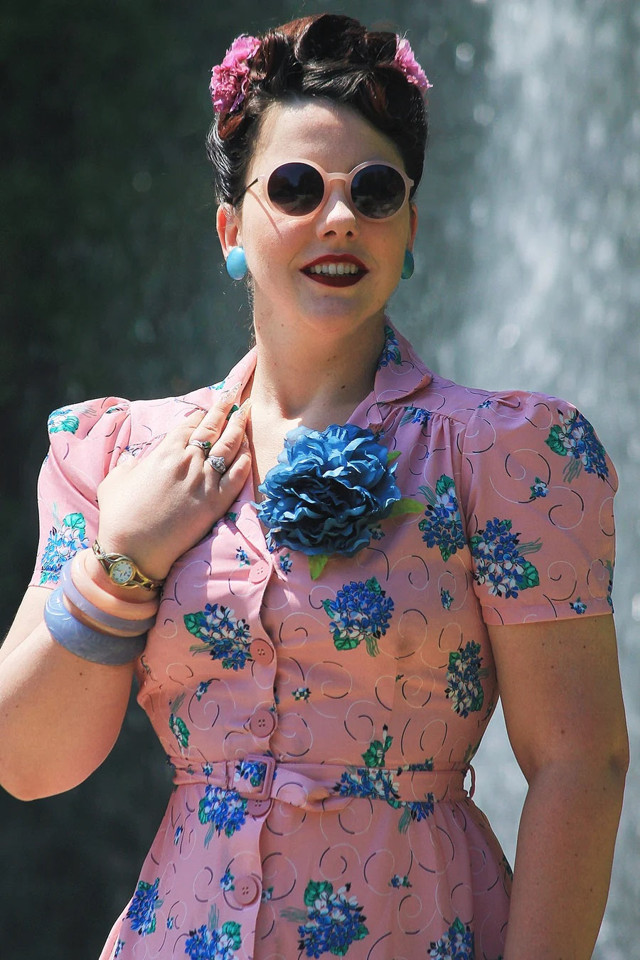 Charlene skjortklänning i rosa med mönster av blombuketter i blått från Rock n Romance, perfekt 1950-talsstil.