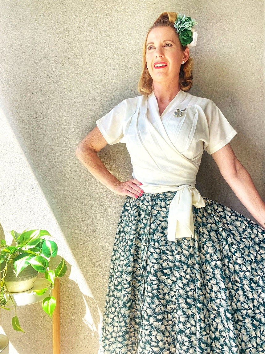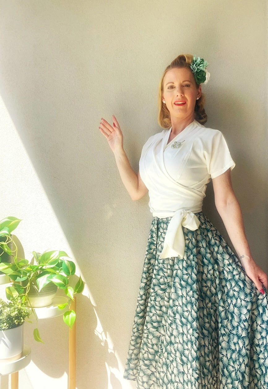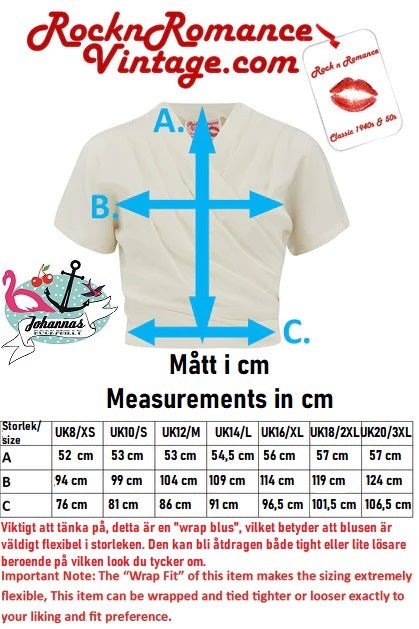 Blusen Darla från Rock n Romantik. Den mest mångsidiga blusen i äkta vintagestil du någonsin kommer att ha. Darla är en blus med full omlott, vilket betyder att passformen är helt flexibel och bröstvecken framtill betyder ännu mer flexibilitet för speciellt för större byster. Knyt den på baksidan eller framsidan, valet är helt ditt för att skapa din perfekta look.. Denna fantastiska och lätta att bära blus lämpar sig för ett stort utbud av klassiska stilar från tidigt 1940-tal ända fram till slutet av 1950-talet. Du kan enkelt kombinera den med kjolar, byxor eller till och med ett par av dina favoritjeans.. Det är verkligen den mest mångsidiga blusen vi vet att du kommer att älska den.